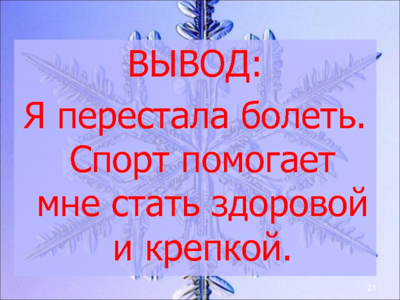 ВЫВОД:Я перестала болеть. Спорт помогает мне стать здоровой и крепкой.