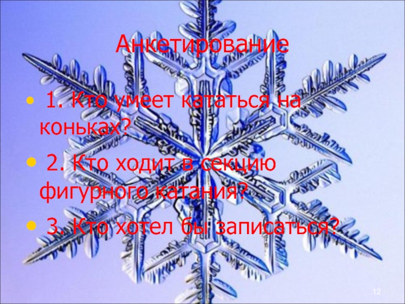 Анкетирование 1. Кто умеет кататься на коньках? 2. Кто ходит в секцию фигурного катания? 3. Кто хотел