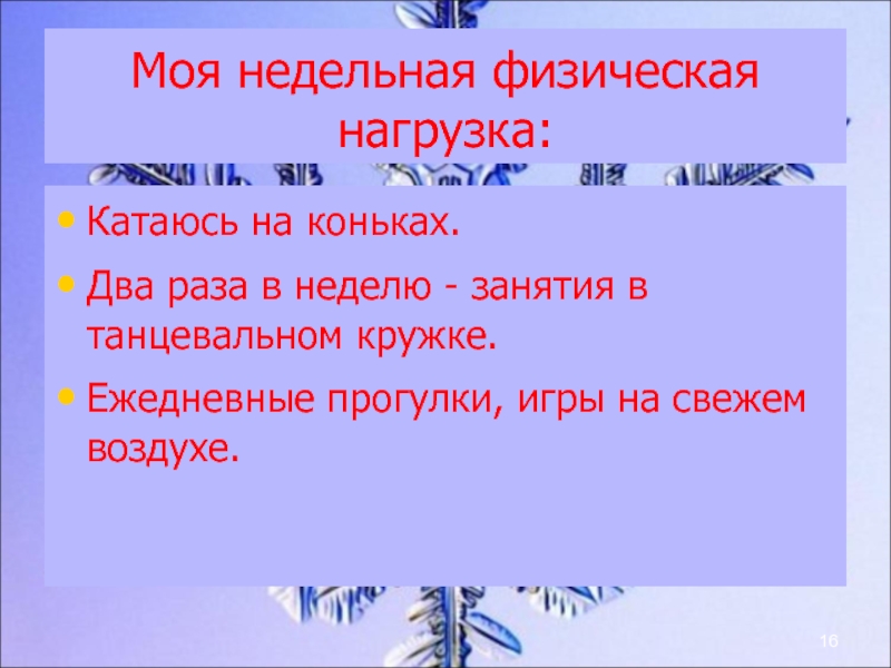Моя недельная физическая нагрузка:Катаюсь на коньках.Два раза в неделю - занятия в танцевальном кружке.Ежедневные прогулки, игры на