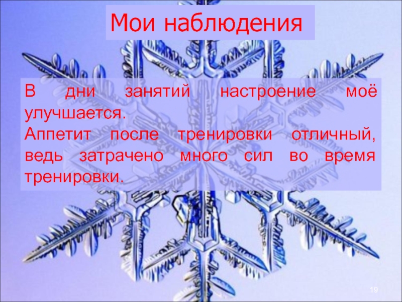 Мои наблюденияВ дни занятий настроение моё улучшается.Аппетит после тренировки отличный, ведь затрачено много сил во время тренировки.