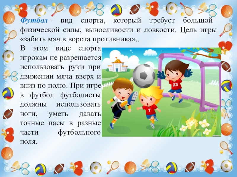 В этом виде спорта игрокам не разрешается использовать руки при движении мяча вверх и вниз по полю. При игре в футбол футболисты должны использовать ноги, уметь давать точные пасы в разные части футбольного поля.