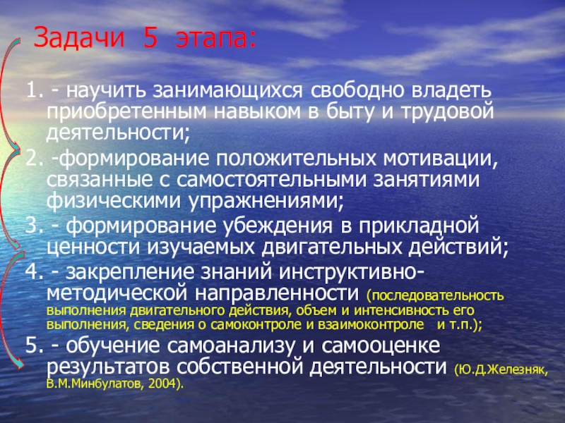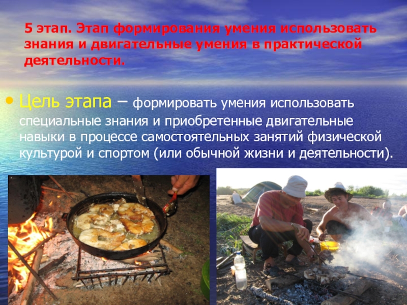 Цель этапа – формировать умения использовать специальные знания и приобретенные двигательные навыки в процессе самостоятельных занятий физической культурой и спортом (или обычной жизни и деятельности).