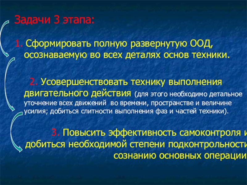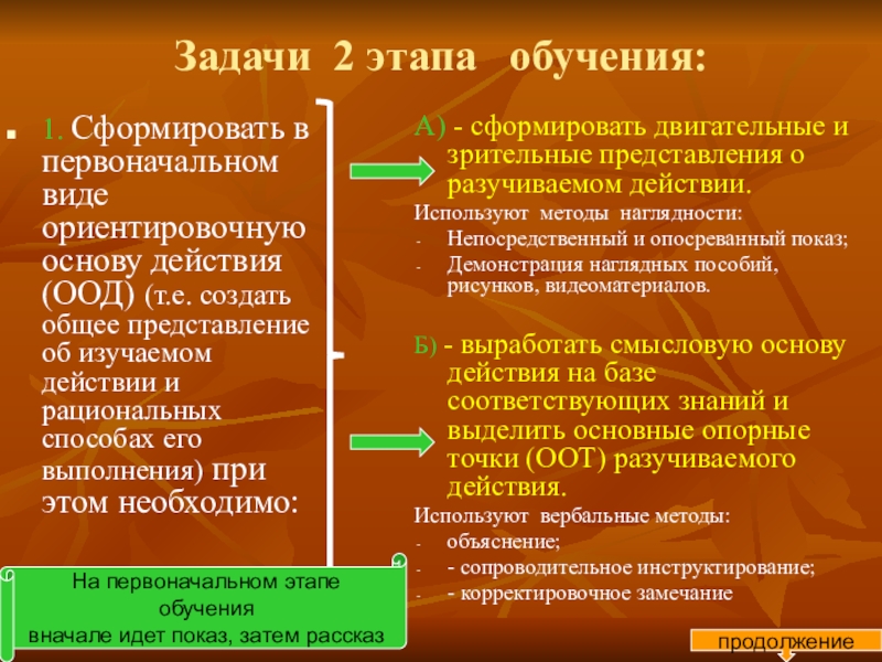 Б) - выработать смысловую основу действия на базе соответствующих знаний и выделить основные опорные точки (ООТ) разучиваемого действия.