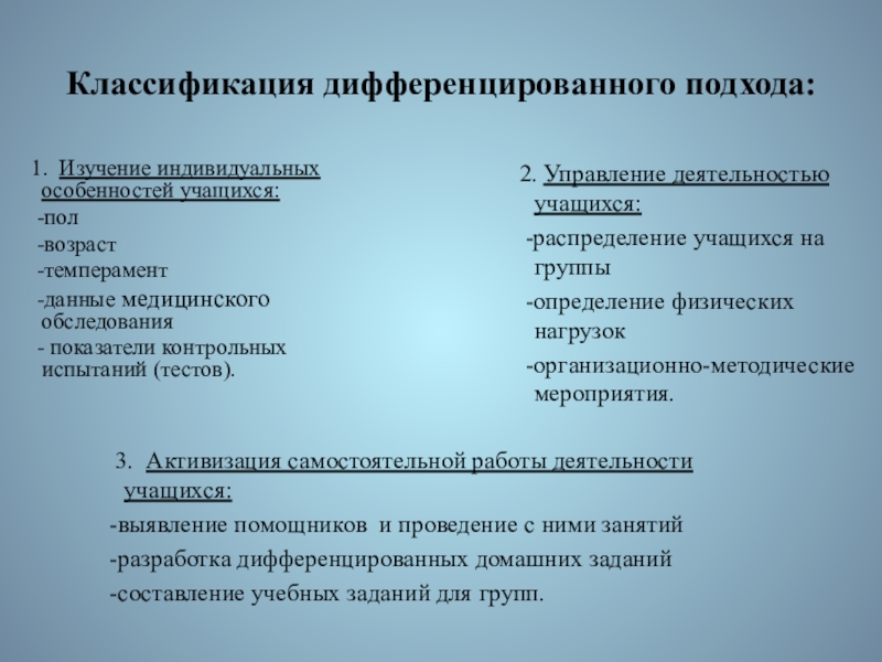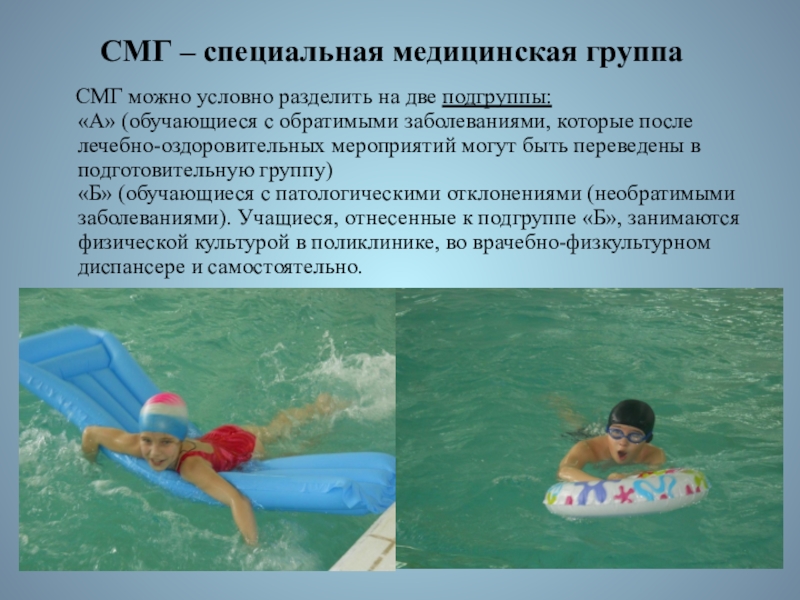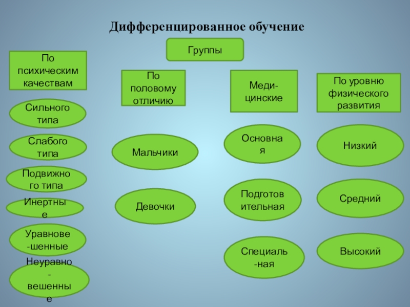 Дифференциация происходит от латинского «differentia», - что в переводе означает – «различие, разделение». В целях дифференцированного подхода к организации уроков ФК все обучающиеся образовательного учреждения по медицинским показателям в зависимости от состояния здоровья делятся на три группы: основную, подготовительную и СМГ.