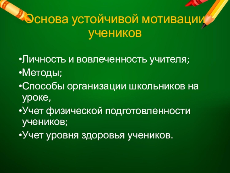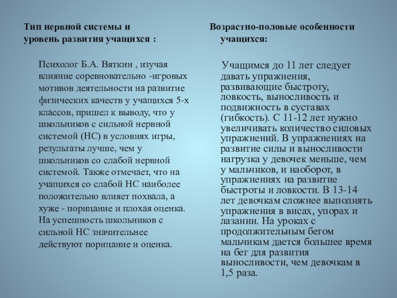 Психолог Б.А. Вяткин , изучая влияние соревновательно -игровых мотивов деятельности на развитие физических качеств у учащихся 5-х классов, пришел к выводу, что у школьников с сильной нервной системой (НС) в условиях игры, результаты лучше, чем у школьников со слабой нервной системой. Также отмечает, что на учащихся со слабой НС наиболее положительно влияет похвала, а хуже - порицание и плохая оценка. На успешность школьников с сильной НС значительнее действуют порицание и оценка.