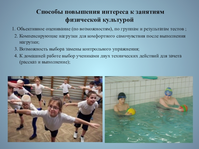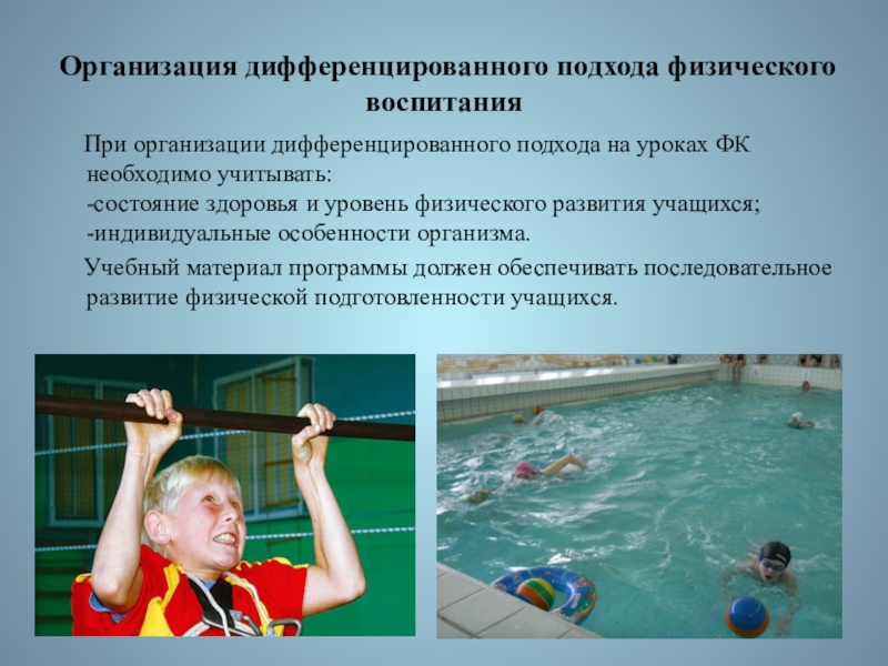 Учащимся до 11 лет следует давать упражнения, развивающие быстроту, ловкость, выносливость и подвижность в суставах (гибкость). С 11-12 лет нужно увеличивать количество силовых упражнений. В упражнениях на развитие силы и выносливости нагрузка у девочек меньше, чем у мальчиков, и наоборот, в упражнениях на развитие быстроты и ловкости. В 13-14 лет девочкам сложнее выполнять упражнения в висах, упорах и лазании. На уроках с продолжительным бегом мальчикам дается большее время на бег для развития выносливости, чем девочкам в 1,5 раза.