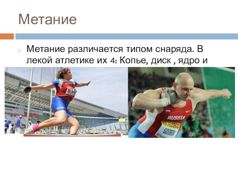 Метание различается типом снаряда. В лекой атлетике их 4: Копье, диск