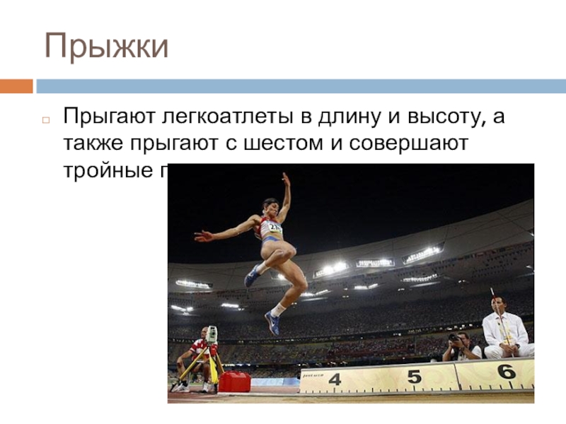 ПрыжкиПрыгают легкоатлеты в длину и высоту, а также прыгают с шестом и совершают тройные прыжки.