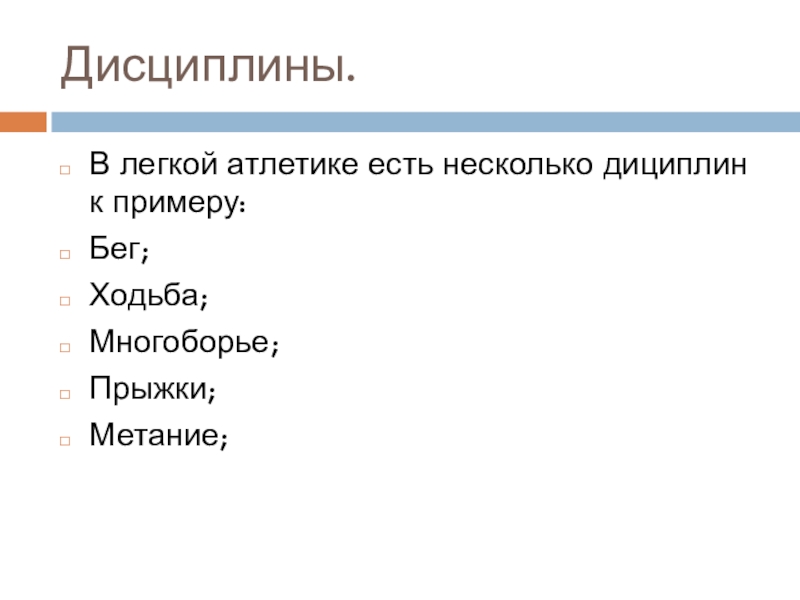 Дисциплины.В легкой атлетике есть несколько дициплин к примеру:Бег;Ходьба;Многоборье;Прыжки;Метание;
