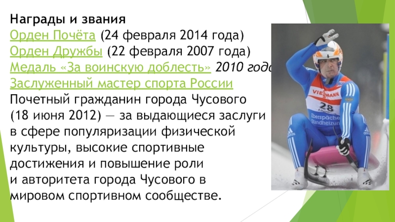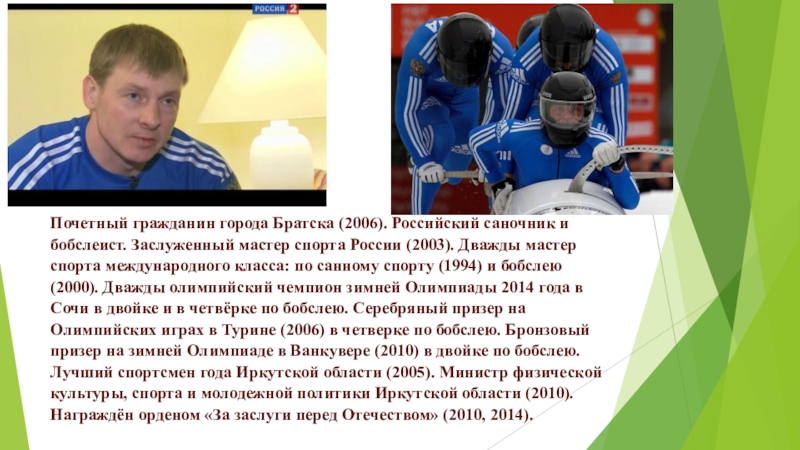 Почетный гражданин города Братска (2006). Российский саночник и бобслеист. Заслуженный мастер