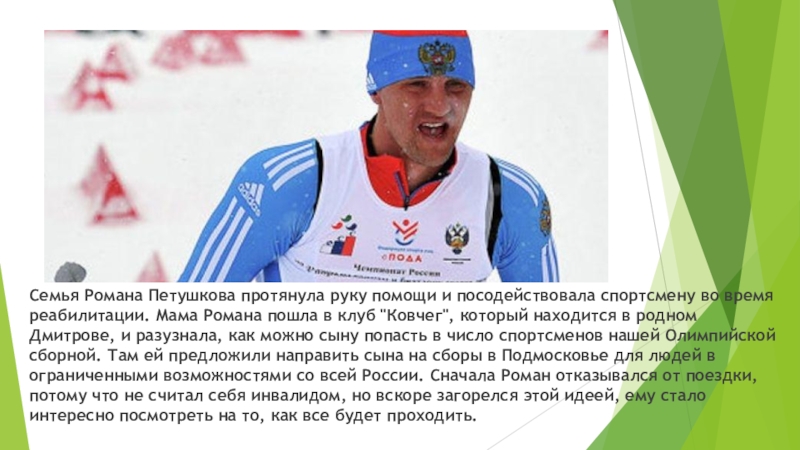 Слайд 26Семья Романа Петушкова протянула руку помощи и посодействовала спортсмену во время