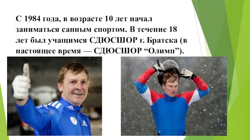 Слайд 4С 1984 года, в возрасте 10 лет начал заниматься санным спортом.