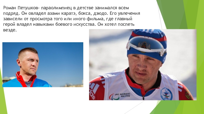 Слайд 24Роман Петушков- параолимпиец в детстве занимался всем подряд. Он овладел азами