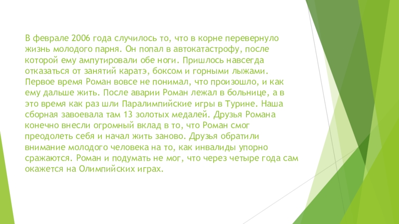 молодого парня. Он попал в автокатастрофу, после которой ему ампутировали обе ноги. Пришлось навсегда отказаться от занятий каратэ, боксом и горными лыжами. Первое время Роман вовсе не понимал, что произошло, и как ему дальше жить. После аварии Роман лежал в больнице, а в это время как раз шли Паралимпийские игры в Турине. Наша сборная завоевала там 13 золотых медалей. Друзья Романа конечно внесли огромный вклад в то, что Роман смог преодолеть себя и начал жить заново. Друзья обратили внимание молодого человека на то, как инвалиды упорно сражаются. Роман и подумать не мог, что через четыре года сам окажется на Олимпийских играх.