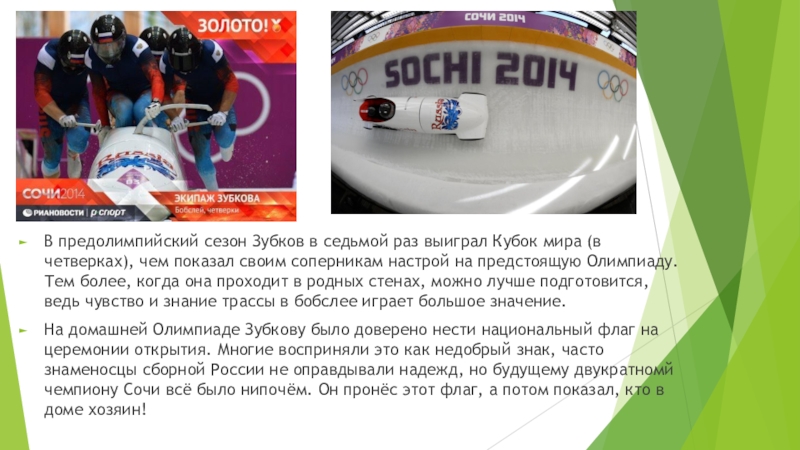 На домашней Олимпиаде Зубкову было доверено нести национальный флаг на церемонии открытия. Многие восприняли это как недобрый знак, часто знаменосцы сборной России не оправдывали надежд, но будущему двукратномй чемпиону Сочи всё было нипочём. Он пронёс этот флаг, а потом показал, кто в доме хозяин!