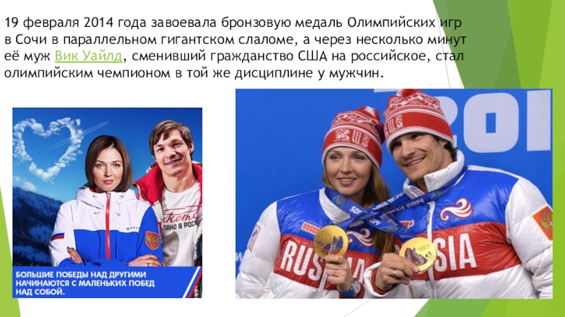 в параллельном гигантском слаломе, а через несколько минут её муж Вик Уайлд, сменивший гражданство США на российское, стал олимпийским чемпионом в той же дисциплине у мужчин.