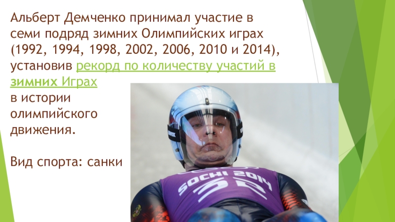 Слайд 14Альберт Демченко принимал участие в семи подряд зимних Олимпийских играх (1992,
