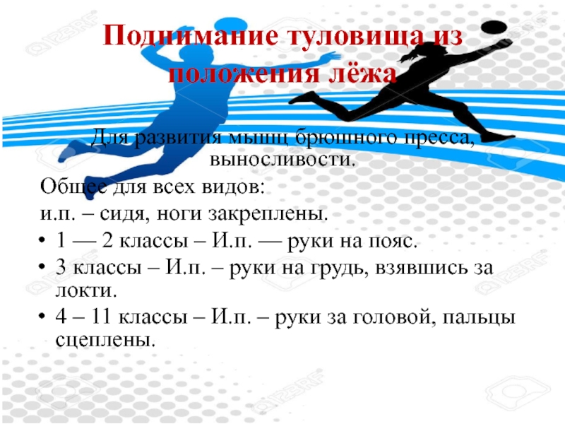 Поднимание туловища из положения лежа.