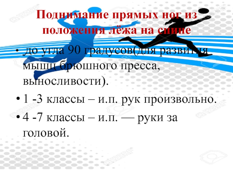 Слайд 15Поднимание прямых ног из положения лёжа на спине