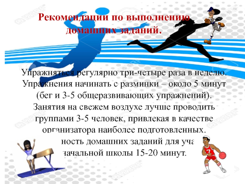 и недели. С этой целью кроме трехразовых занятий в неделю на уроках физической культуры, физкультминуток на общеобразовательных уроках, подвижных перемен и занятий в спортивных секциях, необходимо нацеливать учащихся на выполнение самостоятельных физических упражнений и игр дома, т.е. выполнение домашних заданий.