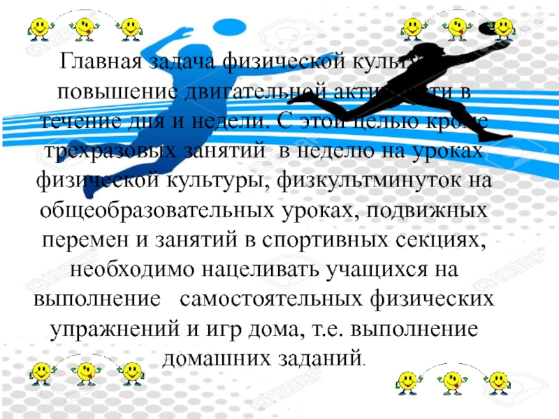 Слайд 2Главная задача физической культуры – повышение двигательной активности в течение дня