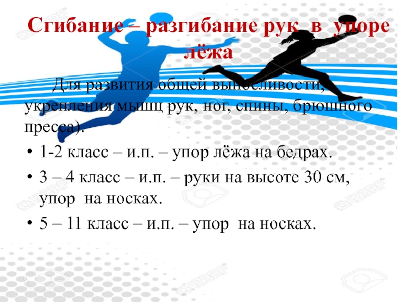 Слайд 17Сгибание – разгибание рук в упоре лёжа
