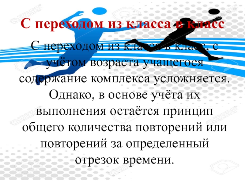 с учётом возраста учащегося содержание комплекса усложняется. Однако, в основе учёта их выполнения остаётся принцип общего количества повторений или повторений за определенный отрезок времени.