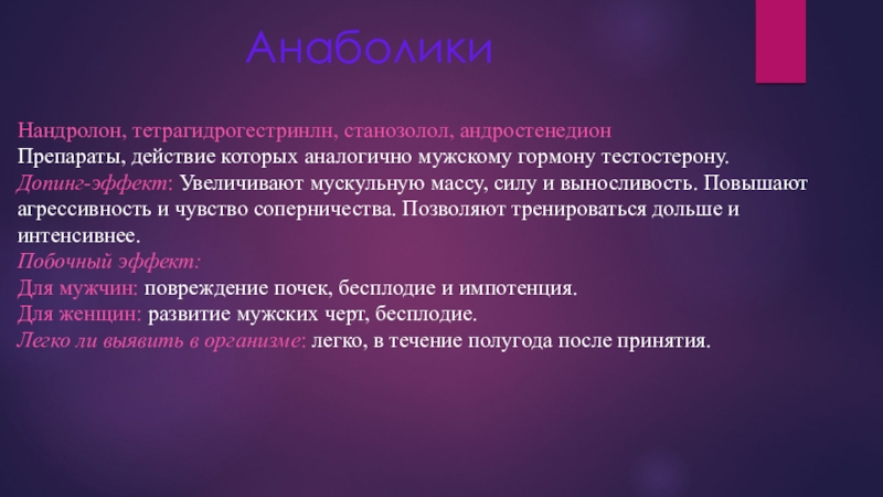 мускульную массу, силу и выносливость. Повышают агрессивность и чувство соперничества. Позволяют тренироваться дольше и интенсивнее.