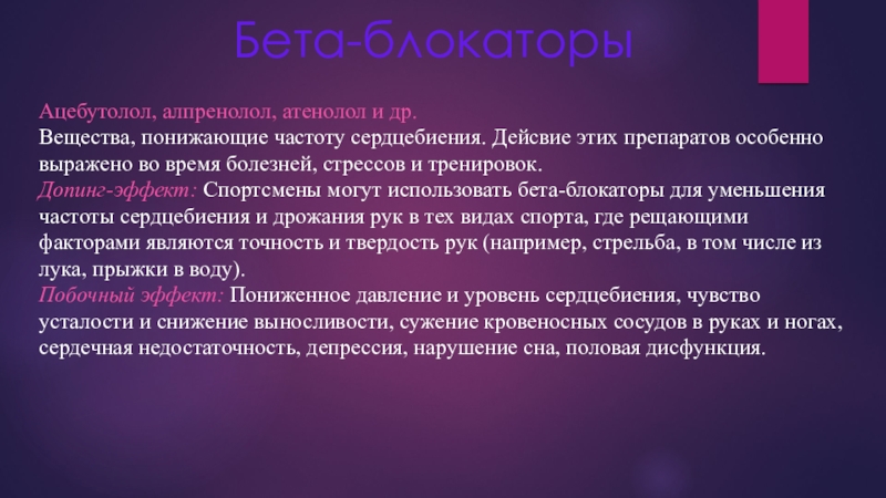 Допинг-эффект: Спортсмены могут использовать бета-блокаторы для уменьшения частоты сердцебиения и дрожания рук в тех видах спорта, где рещающими факторами являются точность и твердость рук (например, стрельба, в том числе из лука, прыжки в воду).