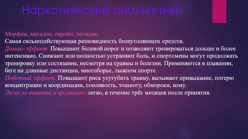 порог и позволяют тренироваться дольше и более интенсивно. Снижают или полностью устраняют боль, и спортсмены могут продолжать тренировку или состязание, несмотря на травмы и болезни. Применяются в плавании, беге на длинные дистанции, многоборье, лыжном спорте.