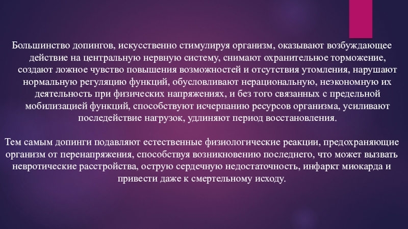 Тем самым допинги подавляют естественные физиологические реакции, предохраняющие организм от перенапряжения, способствуя возникновению последнего, что может вызвать невротические расстройства, острую сердечную недостаточность, инфаркт миокарда и привести даже к смертельному исходу.