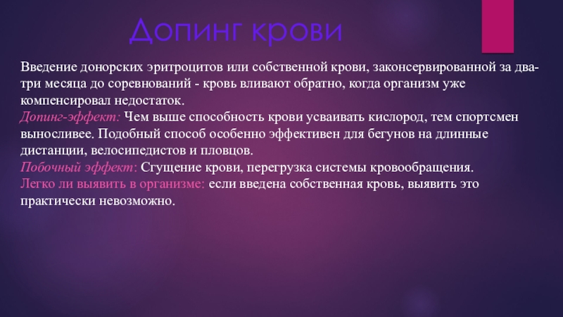 Допинг-эффект: Чем выше способность крови усваивать кислород, тем спортсмен выносливее. Подобный способ особенно эффективен для бегунов на длинные дистанции, велосипедистов и пловцов.