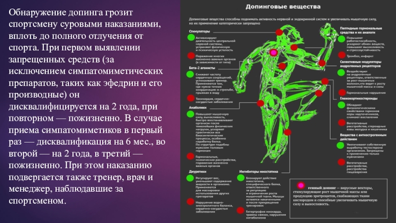 Слайд 18Обнаружение допинга грозит спортсмену суровыми наказаниями, вплоть до полного отлучения от