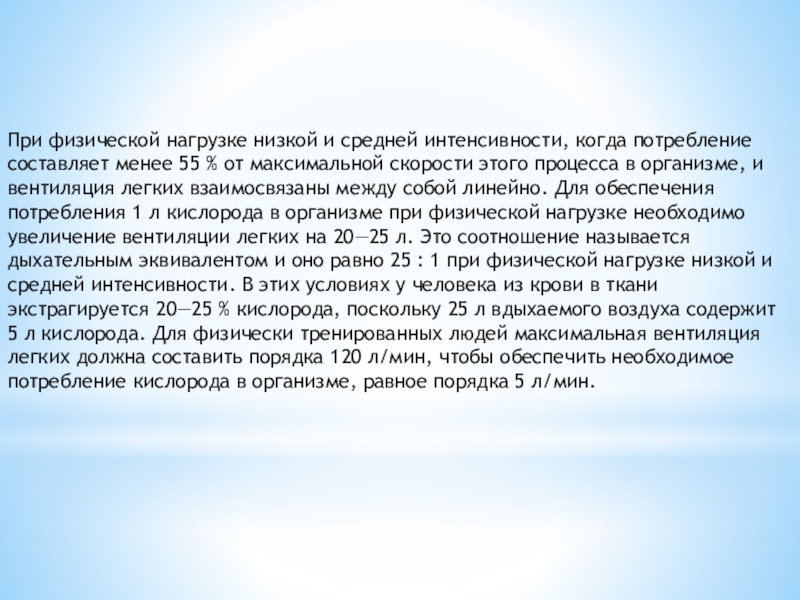 55 % от максимальной скорости этого процесса в организме, и вентиляция легких взаимосвязаны между собой линейно. Для обеспечения потребления 1 л кислорода в организме при физической нагрузке необходимо увеличение вентиляции легких на 20—25 л. Это соотношение называется дыхательным эквивалентом и оно равно 25 : 1 при физической нагрузке низкой и средней интенсивности. В этих условиях у человека из крови в ткани экстрагируется 20—25 % кислорода, поскольку 25 л вдыхаемого воздуха содержит 5 л кислорода. Для физически тренированных людей максимальная вентиляция легких должна составить порядка 120 л/мин, чтобы обеспечить необходимое потребление кислорода в организме, равное порядка 5 л/мин.