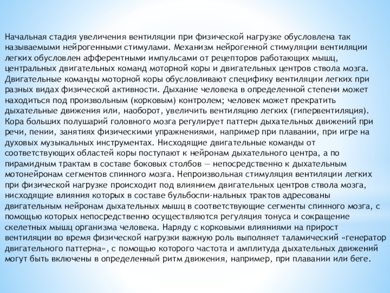 Слайд 8Начальная стадия увеличения вентиляции при физической нагрузке обусловлена так называемыми нейрогенными