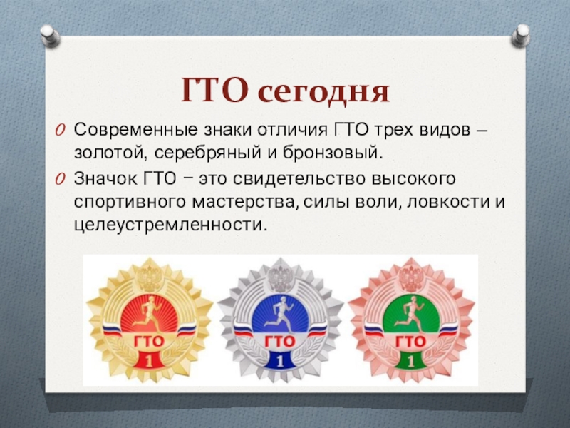 Современные знаки отличия ГТО трех видов – золотой, серебряный и