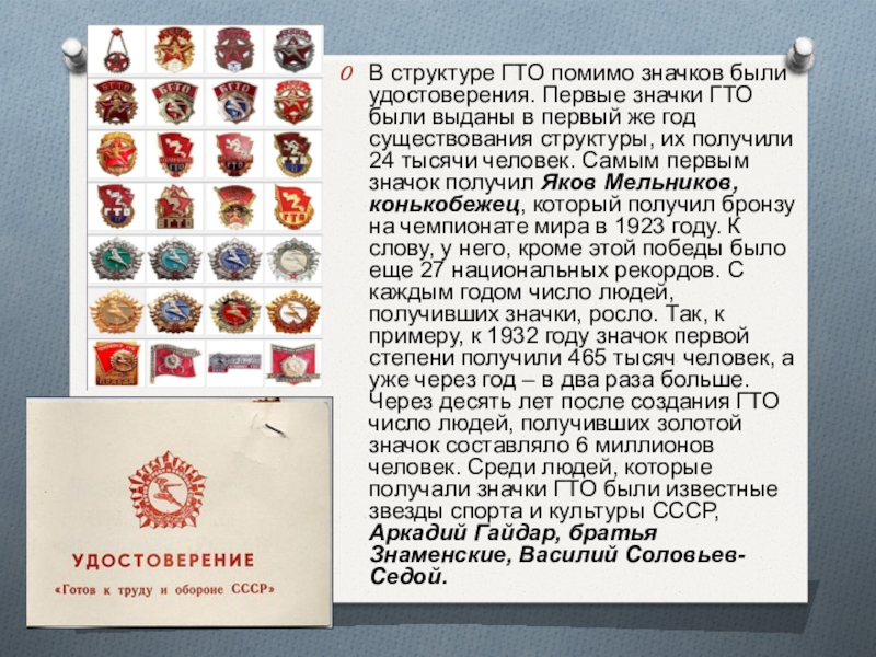 выданы в первый же год существования структуры, их получили 24 тысячи человек. Самым первым значок получил Яков Мельников, конькобежец, который получил бронзу на чемпионате мира в 1923 году. К слову, у него, кроме этой победы было еще 27 национальных рекордов. С каждым годом число людей, получивших значки, росло. Так, к примеру, к 1932 году значок первой степени получили 465 тысяч человек, а уже через год – в два раза больше. Через десять лет после создания ГТО число людей, получивших золотой значок составляло 6 миллионов человек. Среди людей, которые получали значки ГТО были известные звезды спорта и культуры СССР, Аркадий Гайдар, братья Знаменские, Василий Соловьев-Седой.