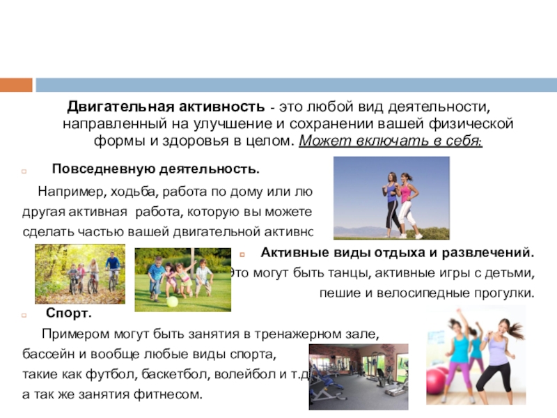 Слайд 6Двигательная активность - это любой вид деятельности, направленный на улучшение и сохранении