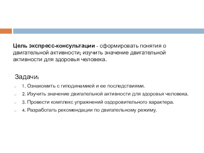 Слайд 2Цель экспресс-консультации - сформировать понятия о двигательной активности; изучить значение двигательной