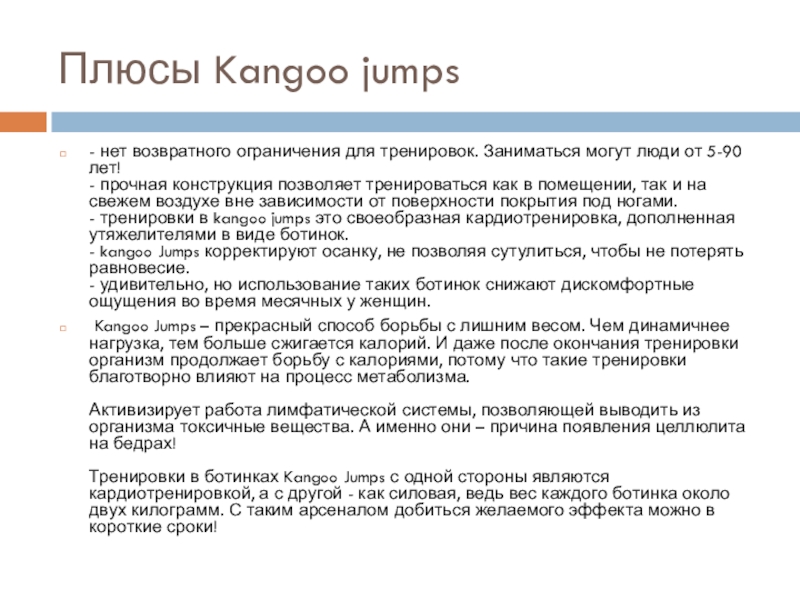 Kangoo Jumps – прекрасный способ борьбы с лишним весом. Чем динамичнее нагрузка, тем больше сжигается калорий. И даже после окончания тренировки организм продолжает борьбу с калориями, потому что такие тренировки благотворно влияют на процесс метаболизма.