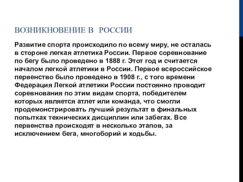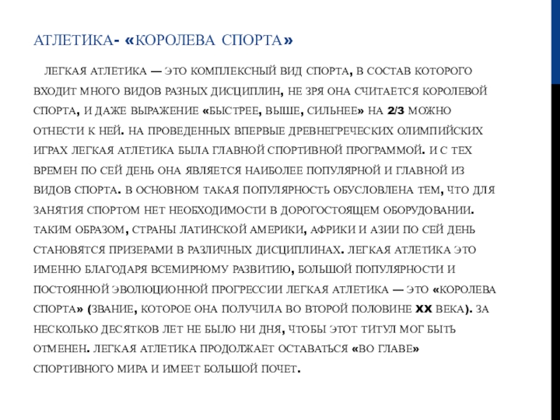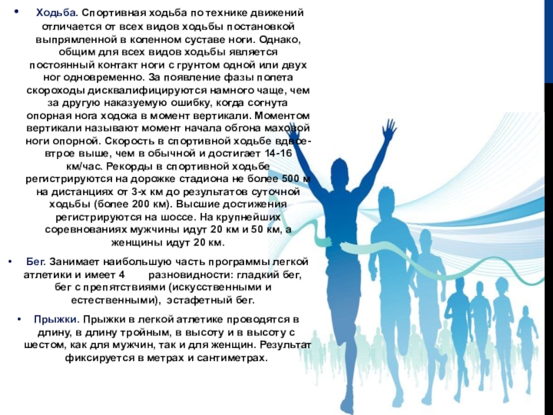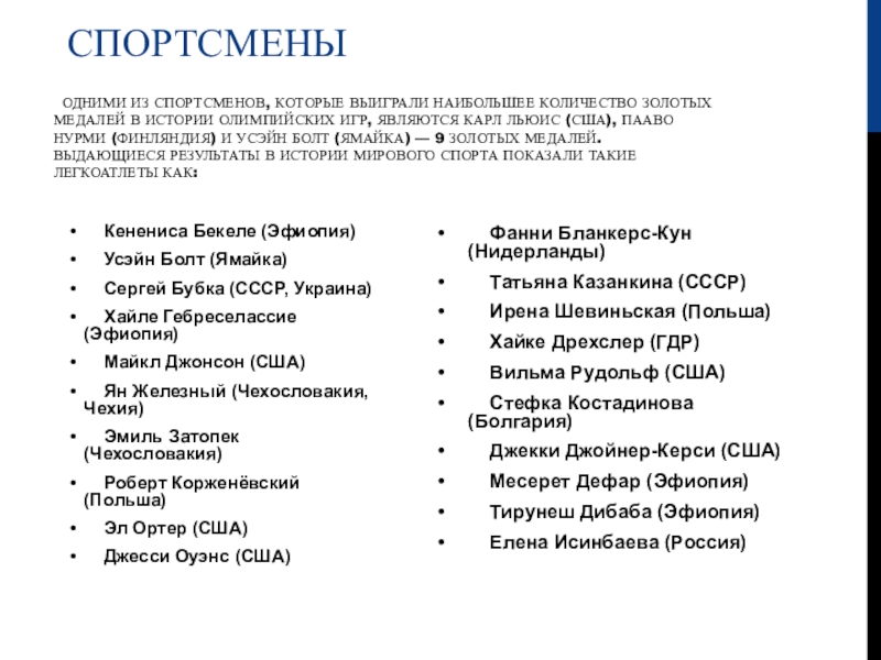 Одними из спортсменов, которые выиграли наибольшее количество золотых медалей в истории Олимпийских игр, являются Карл Льюис (США), Пааво Нурми (Финляндия) и Усэйн Болт (Ямайка) — 9 золотых медалей. Выдающиеся результаты в истории мирового спорта показали такие легкоатлеты как: