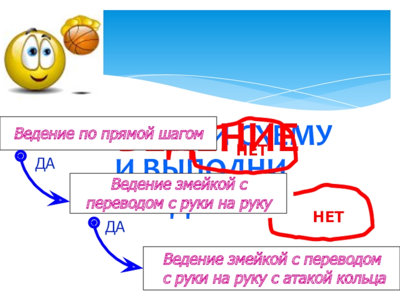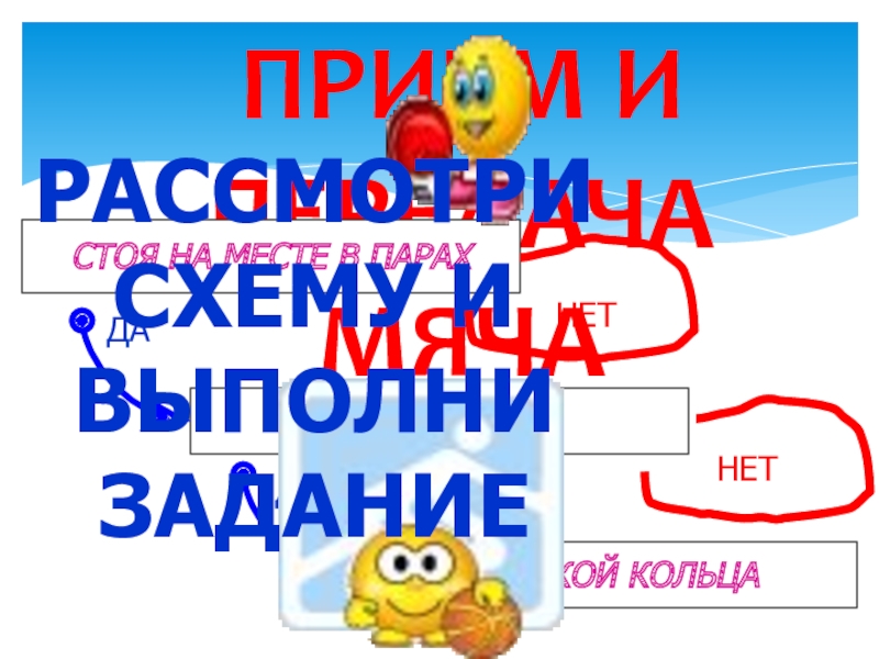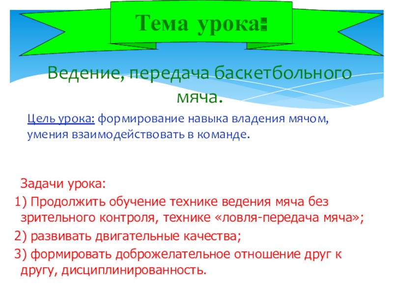 Продолжить обучение технике ведения мяча без зрительного контроля, технике «ловля-передача мяча»;