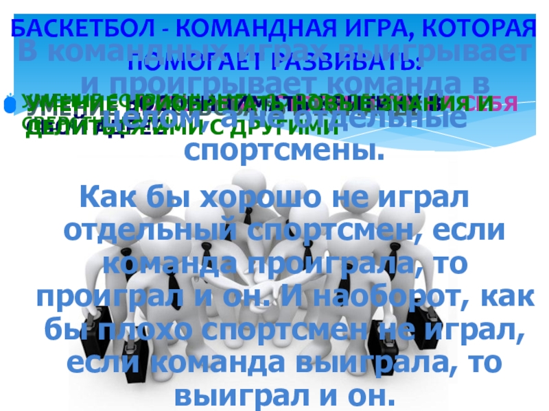 В командных играх выигрывает и проигрывает команда в целом, а не отдельные спортсмены.