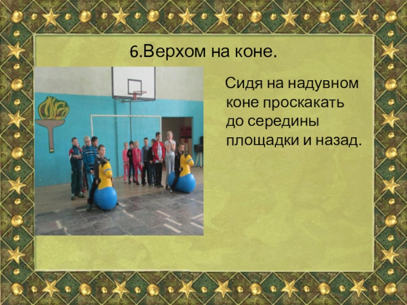 6.Верхом на коне.  Сидя на надувном коне проскакать до середины площадки и назад.