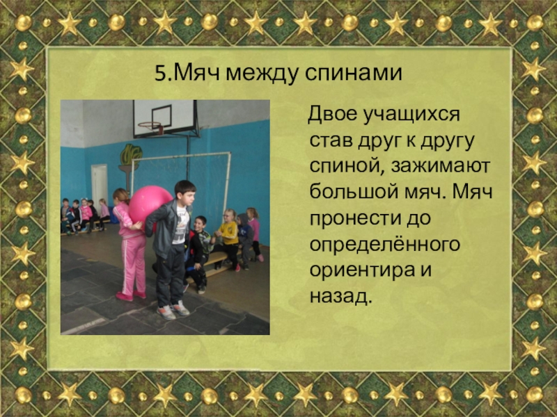 5.Мяч между спинами  Двое учащихся став друг к другу спиной, зажимают большой мяч. Мяч пронести до