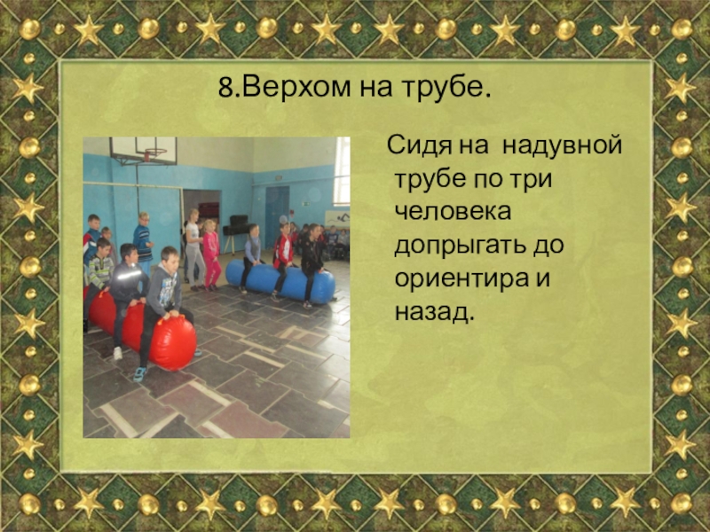 8.Верхом на трубе.  Сидя на надувной трубе по три человека допрыгать до ориентира и назад.