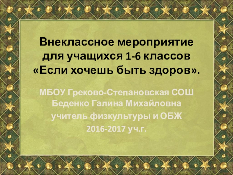Внеклассное мероприятие для учащихся 1-6 классов «Если хочешь быть здоров».МБОУ Греково-Степановская СОШ Беденко Галина Михайловнаучитель физкультуры и ОБЖ 2016-2017 уч.г.