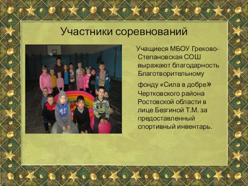 Участники соревнований   Учащиеся МБОУ Греково-Степановская СОШ выражают благодарность Благотворительному фонду «Сила в добре» Чертковского района