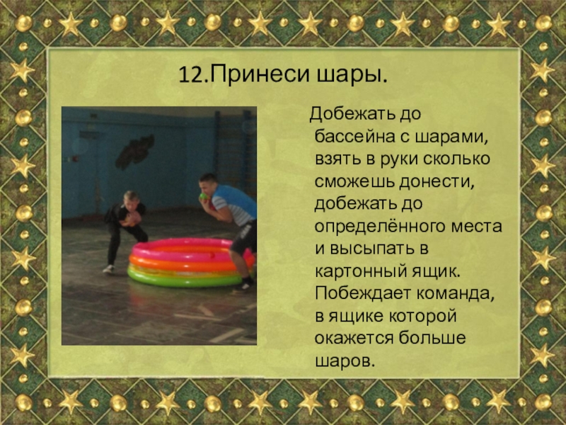 12.Принеси шары.  Добежать до бассейна с шарами, взять в руки сколько сможешь донести, добежать до определённого