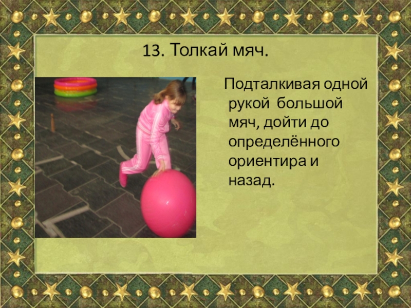 13. Толкай мяч.  Подталкивая одной рукой большой мяч, дойти до определённого ориентира и назад.